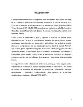 Este documento presenta el informe de prácticas de una estudiante de la Licenciatura en Educación Preescolar en el Jardín de Niños "Niños Héroes" en Ciudad Nezahualcóyotl, México. El informe describe el contexto de la escuela, realiza un diagnóstico del grupo de 3° "C", presenta la fundamentación teórica y planeación de cuatro proyectos realizados, analiza las intervenciones y logros de los estudiantes, y concluye con evidencia del aprendizaje.