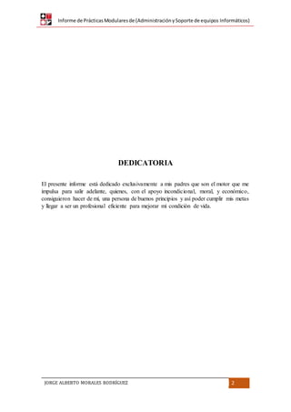 El documento presenta un informe de prácticas realizadas por Jorge Alberto Morales en la Municipalidad Distrital de Santiago de Cao como parte de su formación profesional. Describe los datos generales del practicante y de la institución, la organización de la municipalidad incluyendo sus funciones y objetivos, y las actividades realizadas por el practicante como asistente de informática y telecomunicaciones durante sus 3 meses y 396 horas de práctica.