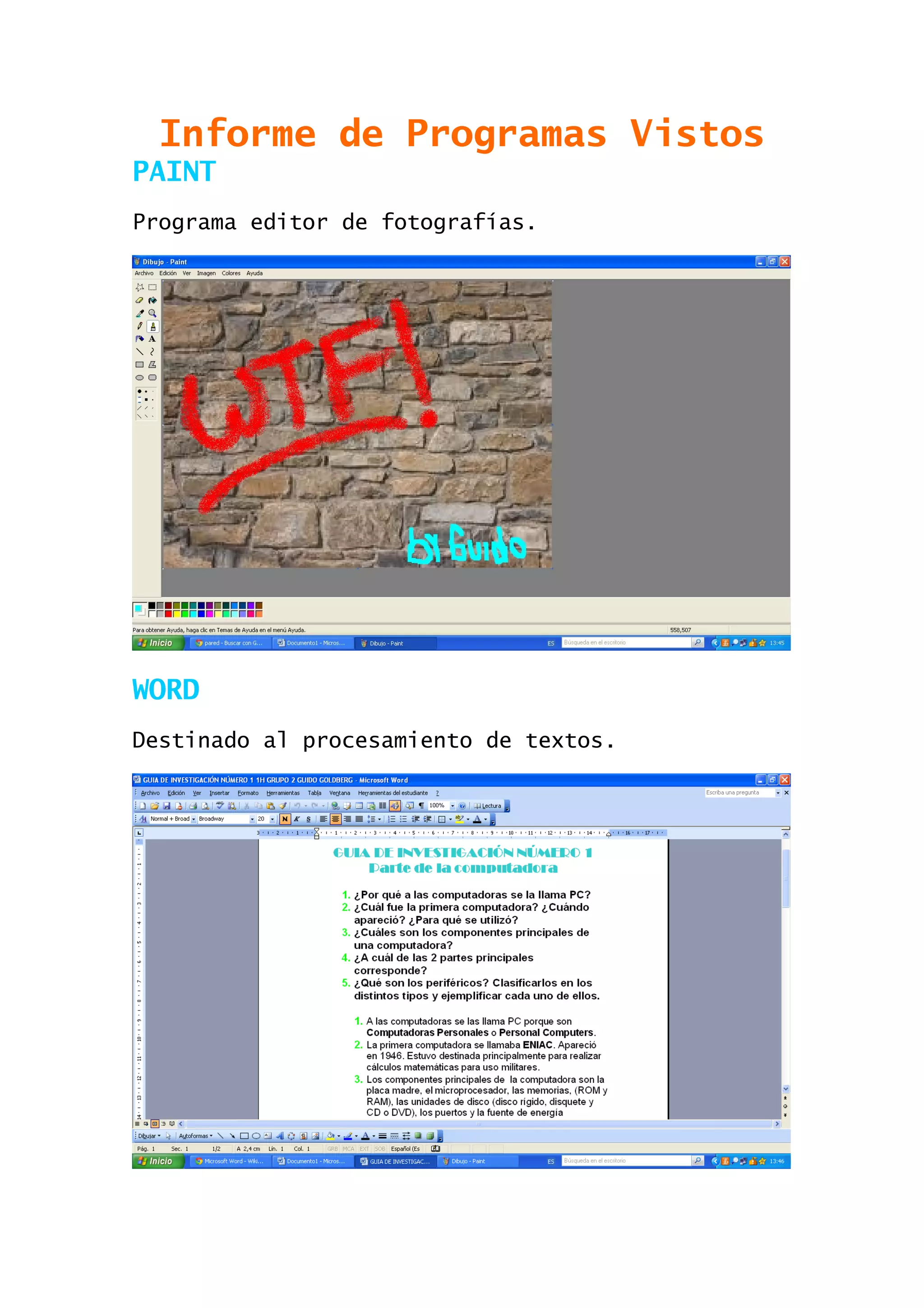 El documento resume programas vistos por Guido Goldberg en el primer semestre de 2013 en CBC. Incluye programas de edición de fotografías (PAINT), procesamiento de textos (WORD), presentaciones (POWER POINT), creación de blogs (BLOGGER), compartir presentaciones (SLIDESHARE), páginas web multimedia (GLOGSTER), nubes de palabras (TAGXEDO), historietas en línea (PIXTON) y edición de videos (MOVIE MAKER).