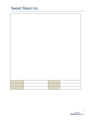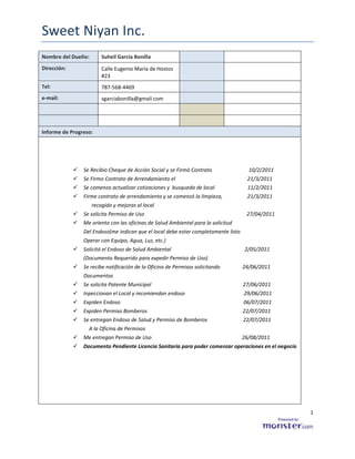Este documento presenta un resumen de progreso para la apertura de Sweet Niyan Inc., una panadería propiedad de Suheil García Bonilla. Detalla los pasos tomados entre febrero y agosto de 2011 para obtener los permisos necesarios, incluyendo la firma de contratos de arrendamiento, solicitud de permisos de uso y endosos de salud ambiental, y la inspección y aprobación final del local. El único documento pendiente es la licencia sanitaria requerida para comenzar las operaciones.