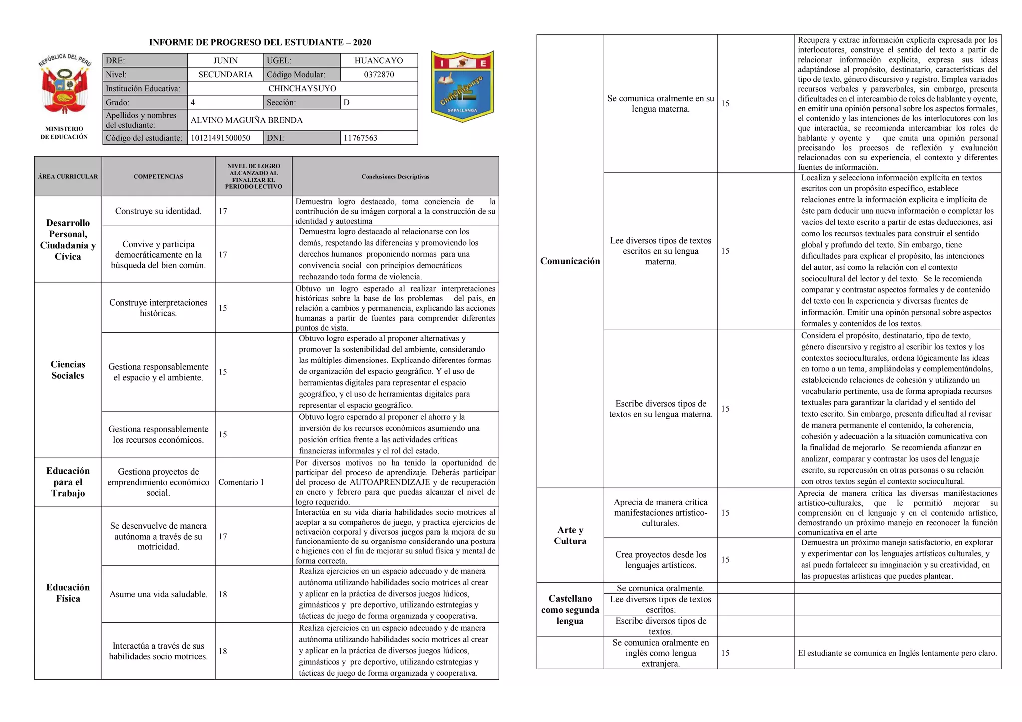 Este informe de progreso estudiantil resume los logros alcanzados por Brenda Alvino Maguiña en varias áreas curriculares. En general, Brenda obtuvo logros destacados o esperados en la mayoría de áreas como Desarrollo Personal, Ciencias Sociales, Comunicación, Matemática y Ciencia y Tecnología. Se recomienda que mejore en el intercambio de roles al comunicarse oralmente y en analizar textos escritos. El informe también incluye los resultados de Andy Andamayo Aguilera, pero no