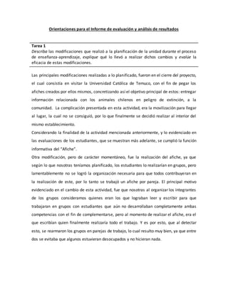 El documento analiza la evaluación y modificación de la planificación de un proyecto pedagógico centrado en la creación de afiches informativos sobre animales chilenos en peligro de extinción. Se detallan los logros de aprendizaje de los estudiantes en las áreas de lenguaje y comunicación, así como en ciencias naturales, resaltando una mejoría en la primera. A pesar de los desafíos en la organización del trabajo en grupos, las modificaciones realizadas a la enseñanza resultaron efectivas, aunque se identificó una necesidad de mayor refuerzo en el contenido de ciencias naturales.