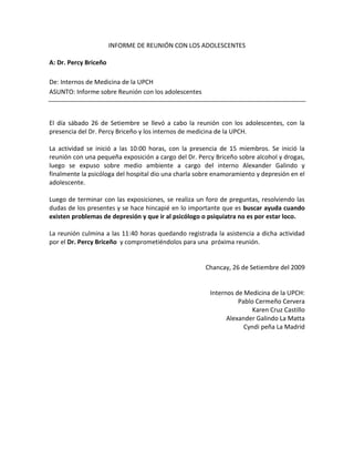 La reunión con adolescentes se llevó a cabo el 26 de setiembre con 15 miembros presentes. El Dr. Briceño y los internos de medicina hicieron presentaciones sobre alcohol, drogas y medio ambiente, y la psicóloga del hospital habló sobre enamoramiento y depresión en adolescentes. Luego de responder preguntas y enfatizar la importancia de buscar ayuda para la depresión, la reunión terminó a las 11:40 a.m.