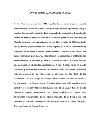 Sor Juana Inés de la Cruz fue una monja, poeta, dramaturga y filósofa mexicana del siglo XVII conocida como "El Fénix de América". Tuvo una educación autodidacta desde muy joven y destacó en la corte virreinal por su erudición. Ingresó a un convento para retirarse de la vida cortesana y allí plasmó su amplia obra que incluye más de 200 poemas, 5 obras de teatro y prosa donde sintetizó las tendencias literarias de su época. Es considerada un