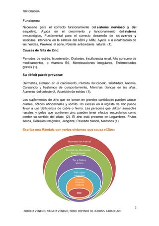 El documento presenta los resultados de una práctica de laboratorio sobre intoxicación por zinc. Se administró cloruro de zinc a las vísceras de un pollo y se realizaron reacciones de reconocimiento que dieron resultados positivos, identificando la presencia de zinc. El objetivo era determinar las reacciones que permiten reconocer zinc y verificar el color característico de cada reacción para confirmar la intoxicación por este metal.