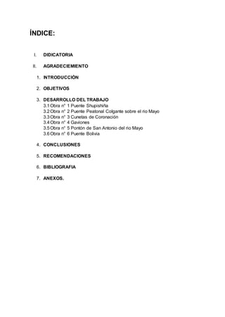 El documento presenta un informe de una visita a obras de construcción civil realizada por un alumno como parte de su formación. El resumen describe 6 obras observadas: 1) Puente Shupishiña, 2) Puente peatonal colgante sobre el río Mayo, 3) Cunetas de coronación, 4) Gaviones, 5) Pontón de San Antonio del río Mayo, y 6) Puente Bolivia. El informe detalla los procesos constructivos, materiales y estructuras de cada obra para complementar los conocimientos teóricos del alumno.