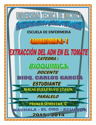 Este documento presenta los detalles de un laboratorio sobre la extracción de ADN de tomate. El objetivo es utilizar técnicas sencillas para extraer y observar la estructura fibrilar del ADN vegetal. Se describe el procedimiento que incluye triturar tomate, mezclarlo con sal, bicarbonato y jabón, y agregar alcohol para precipitar el ADN. El resultado esperado es observar fragmentos de ADN en la parte central del tubo de ensayo.