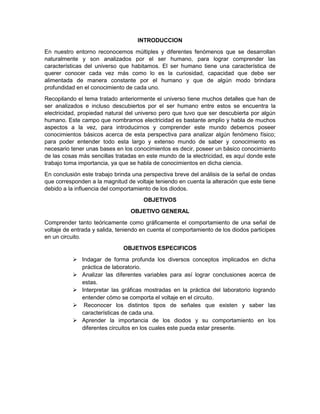 Este informe de laboratorio presenta los resultados de un experimento sobre el comportamiento de señales de voltaje en un circuito que incluye diodos. El objetivo general era comprender teórica y gráficamente cómo los diodos afectan las señales de entrada y salida de voltaje. El marco teórico explica conceptos clave como resistencia, voltaje, potencia e intensidad de corriente necesarios para entender el experimento.