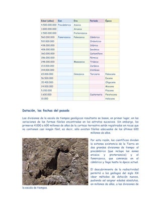 1) La Tierra ha experimentado muchos cambios desde su formación, incluyendo etapas primitivas sin evidencia y la evolución de eones, eras, periodos y épocas geológicas. 2) Se obtienen registros geológicos de cuatro tipos de rocas producidas por actividad cortical. 3) El descubrimiento de la radiactividad permitió dataciones absolutas que asignan edades a las divisiones de tiempo geológico.