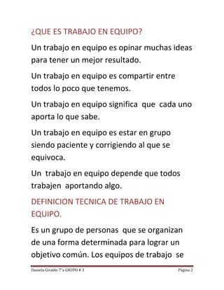 El documento presenta los métodos de aprendizaje individual "lluvia de ideas" y de trabajo en equipo. Define el trabajo en equipo como un proceso en el que cada persona aporta sus habilidades y conocimientos para lograr un objetivo común, requiriendo comunicación, paciencia y corrección mutua.