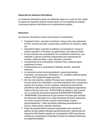 Este documento describe la historia y evolución de los computadores, desde las primeras supercomputadoras y mainframes hasta las computadoras personales modernas como las laptops y tabletas. También discute los componentes clave de los sistemas informáticos, como el hardware físico y el software lógico. Además, presenta algunos ejemplos emergentes de tecnología futura como videos 360°, implantes oculares bioelectrónicos y dispositivos que permiten a las personas con discapacidades controlar computadoras con la mirada u otras señales nerv