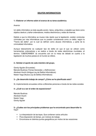 Este documento presenta el avance de un trabajo académico sobre delitos informáticos realizado por un grupo de estudiantes. Resume las contribuciones de cada miembro, detalla que implementarán encuestas en línea como trabajo de campo, y establece el orden de las exposiciones. También identifica algunos problemas encontrados como la interpretación de leyes y falta de tiempo debido a motivos laborales y de vacaciones.