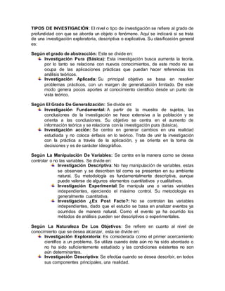 El documento detalla los tipos y diseños de investigación, así como las técnicas de recolección y análisis de datos, enfatizando la importancia de la confiabilidad y validación en el estudio. Se clasifican las investigaciones en varios tipos, incluyendo exploratoria, descriptiva y explicativa, y se discuten metodologías cualitativas y cuantitativas, destacando la elección adecuada del diseño según los objetivos del estudio. Además, se describen diferentes técnicas de recolección de datos como encuestas, entrevistas y observaciones, y se presentan métodos de análisis de datos cualitativos y cuantitativos.