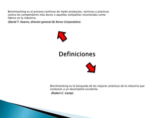 El documento define benchmarking como el proceso de medir productos, servicios y prácticas de una empresa contra los líderes de la industria con el fin de buscar las mejores prácticas. Explica que el benchmarking puede ser interno, comparando unidades dentro de una empresa, o externo comparando con competidores directos u otras empresas no competitivas. Además, describe las etapas del proceso de benchmarking que incluyen la selección de un objetivo, recopilación y análisis de datos, integración de las mejores prácticas e implement