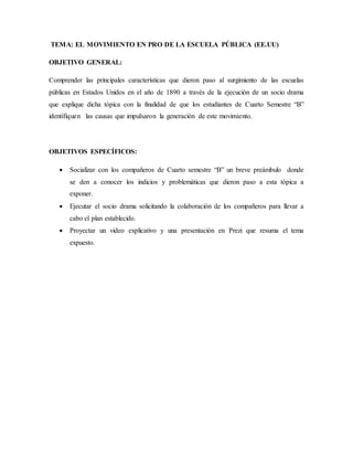 El documento describe el surgimiento del movimiento a favor de las escuelas públicas en Estados Unidos entre 1890. Explica que la Revolución Industrial creó descontento entre los trabajadores, mientras beneficiaba a unos pocos industriales. Grupos reformistas buscaron una nueva sociedad a través de la educación desde 1840, creando enfrentamientos. En 1890, las escuelas servían al desarrollo industrial capitalista. El industrial Horace Mann impulsó una pedagogía al servicio de los industriales, generando protestas entre maestros y reformistas. Finalmente, se