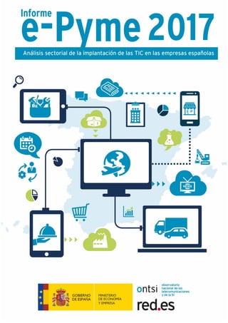 El informe e-pyme 2017 evalúa la implantación de las TIC en sectores empresariales de España, abordando datos del Instituto Nacional de Estadística sobre la transformación digital en las empresas. Analiza diez sectores que representan el 72,8% de las empresas, destacando el papel vital de la digitalización para el crecimiento empresarial. Además, se introduce un indicador sintético que permite comparar el grado de integración tecnológica en diversas categorías empresariales.