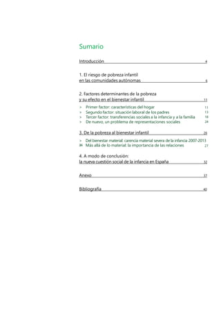 Este documento resume la situación de la pobreza infantil en España. Indica que los niños son el grupo más vulnerable al riesgo de pobreza en todas las comunidades autónomas, con una tasa del 29,9%. Andalucía, Cataluña, Comunidad Valenciana y Madrid concentran la mayor parte de los 1,5 millones de niños en riesgo de pobreza. Las tasas son más altas en Murcia, Canarias, Extremadura, Baleares y Castilla-La Mancha, mientras que Navarra tiene la tasa más baja. El documento anal