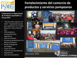 El Instituto de Promoción Productiva realizó diversas actividades en 2015, incluyendo la organización de la expoPyMEs La Pampa, la certificación y promoción del Sello de Calidad Producto de La Pampa, el desarrollo de cadenas productivas en el sudeste pampeano y el cluster porcino, la asistencia técnica a PyMEs, capacitaciones, ferias y promoción del diseño, y el apoyo a emprendedores.
