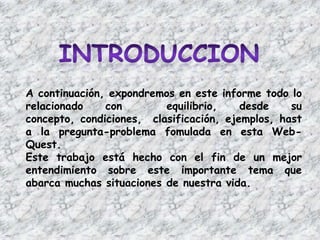 Este documento resume el concepto de equilibrio en tres oraciones. Explica que el equilibrio ocurre cuando la resultante y el momento de las fuerzas aplicadas a un cuerpo son nulos. Define tres tipos de equilibrio - estable, inestable e indiferente - y proporciona ejemplos de cada uno. Finalmente, concluye que el equilibrio depende de la posición del centro de gravedad respecto al punto de apoyo.