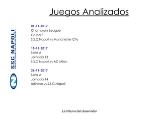 El informe analiza el estilo defensivo del Napoli en la temporada 2017-2018. Describe que el Napoli presiona agresivamente al adversario en zonas altas con líneas defensivas adelantadas. Mantienen el equilibrio defensivo al recuperar rápidamente la posición después de la pérdida del balón. Su transición defensiva es efectiva al cerrar espacios y forzar errores del oponente.
