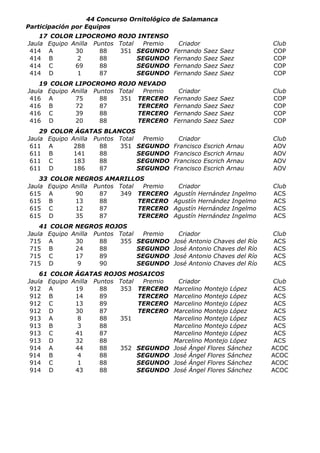 Este documento presenta los resultados del 44 Concurso Ornitológico de Salamanca, incluyendo los puntos totales y premios de los equipos participantes organizados por color y tipo. Se enumeran los nombres de los criadores, clubes a los que pertenecen y los puntos obtenidos por cada ave dentro de cada equipo.