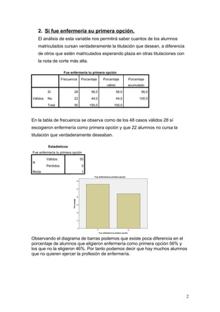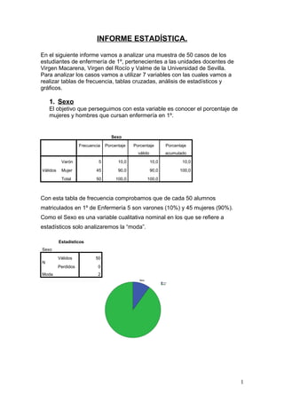 Este informe estadístico analiza una muestra de 50 estudiantes de enfermería de primer año en tres universidades de Sevilla. El informe examina 7 variables como el sexo, si enfermería fue su primera opción, la nota de acceso, la frecuencia de estudio, el interés por ramas de enfermería y el año de nacimiento. Los resultados muestran que la mayoría de los estudiantes son mujeres, el 56% eligió enfermería como primera opción y la nota media de acceso fue 10,5. La mayoría estudia entre semana y pre