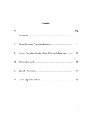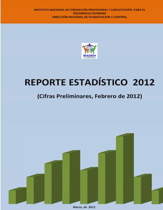 El documento presenta estadísticas preliminares sobre los cursos y programas presenciales, sesiones de formación y matrícula del INADEH en 2012. Se iniciaron 441 cursos presenciales, con una matrícula total de 11,379 personas. El sector de comercio y servicios representó la mayor parte de la matrícula con 7,367 personas. Se impartieron 18,465 horas de formación en total. La información se presenta desglosada por área de formación, centro de formación y provincia/comarca.