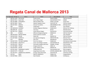 Este documento proporciona una lista de 23 barcos participantes en la Regata Canal de Mallorca 2013, incluyendo su número, país, matrícula, nombre, patrón, marca y modelo de cada barco y el club al que pertenece. La regata contó con la participación de embarcaciones de España, Reino Unido, Francia e independientes.