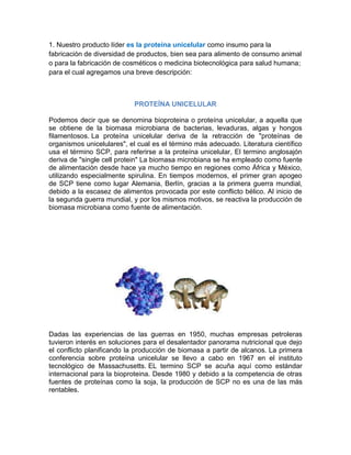 Este documento describe la exportación de proteína unicelular de Colombia a Perú y Suiza. Resume la descripción, producción, usos y regulaciones de la proteína unicelular, así como los mercados potenciales, canales de distribución y acuerdos comerciales en los países destino.