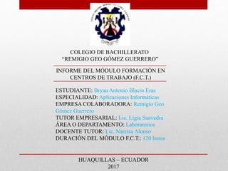 El documento resume el informe del módulo de Formación en Centros de Trabajo (FCT) realizado por Bryan Antonio Blacio Eras en la especialidad de Aplicaciones Informáticas en la empresa Remigio Geo Gómez Guerrero. Durante las 3 semanas, Bryan asistió a capacitaciones, vigiló los laboratorios de computación, realizó mantenimiento a equipos, instaló programas y cables de red, ayudó con el inventario de equipos y las inscripciones para exámenes. La experiencia le permitió aplicar conocimientos y desarroll