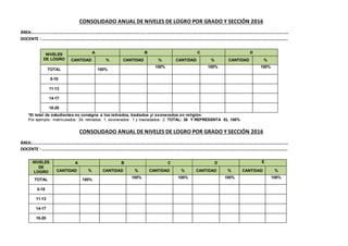 Este documento contiene estadísticas anuales de estudiantes de un grado y sección específicos, incluyendo el número de estudiantes matriculados, aprobados, que requieren recuperación, retirados y exonerados. También incluye tablas consolidadas de logros de aprendizaje por grado, sección y área, con detalles de cantidades y porcentajes de estudiantes en diferentes niveles de desempeño. Finalmente, presenta análisis de áreas críticas y compromisos para mejorar los aprendiz