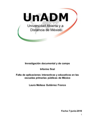Este documento presenta los resultados de una investigación sobre la falta de aplicaciones interactivas y educativas en las escuelas primarias públicas de México. La autora visitó varias escuelas para observar las condiciones y necesidades tecnológicas, y aplicó entrevistas y encuestas a maestros y padres. Los hallazgos mostraron que las escuelas carecen de infraestructura y recursos tecnológicos, y que tanto maestros como alumnos podrían beneficiarse de aplicaciones educativas. La autora concluye que