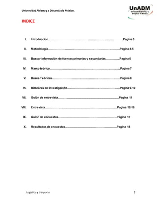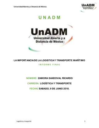 Este documento presenta un informe final sobre la importancia de la logística y el transporte marítimo realizado por Ricardo Zamora Sandoval para la Universidad Abierta y a Distancia de México. El informe incluye una introducción sobre el tema, objetivos y propósito de la investigación, una metodología detallada, una revisión de fuentes primarias y secundarias, un marco teórico, entrevistas y encuestas realizadas. El objetivo principal era aprender sobre este tema y ofrecer estrategias a una empresa n