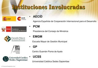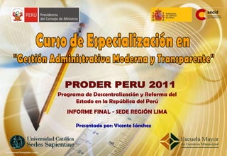 Este informe final resume un programa de capacitación sobre descentralización y reforma del estado realizado en las ciudades de Barranca y San Vicente de Cañete, Perú. El programa consistió en 5 módulos mensuales de capacitación teórico-práctica para autoridades y funcionarios locales con el objetivo de mejorar la gestión municipal y promover el desarrollo local. Más de 140 personas participaron y replicaron lo aprendido en 25 capacitaciones adicionales a otras 511 personas de las municipalidades. El informe concluye felicitando a los particip