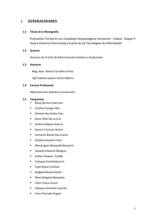 Este documento presenta un estudio sobre la promoción de dos complejos arqueológicos en Lambayeque, Perú a través de tecnologías de información. En primer lugar, describe brevemente los complejos y la necesidad de darlos a conocer para impulsar el turismo. Luego, presenta un marco teórico sobre turismo y sus características. Finalmente, propone utilizar medios digitales como blogs, redes sociales y páginas web para promocionar los sitios y atraer más visitantes.