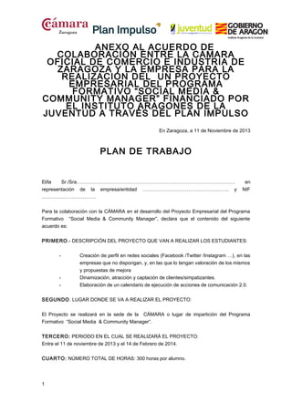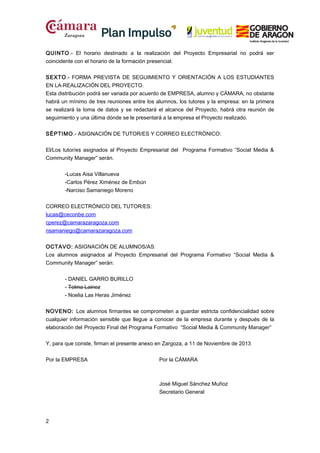 Este documento resume tres reuniones entre la Cámara de Comercio de Zaragoza, una empresa y estudiantes para el desarrollo de un proyecto de marketing digital. La primera reunión establece los objetivos del proyecto de crear perfiles en redes sociales y dinamizar la captación de clientes. La segunda reunión presenta la propuesta de los estudiantes y se definen las modificaciones para la ejecución. La tercera reunión presenta y evalúa el proyecto final, concluyendo que el contenido publicado fue útil