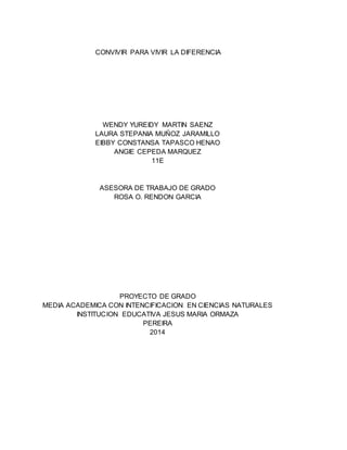 Este documento describe el proceso de investigación llevado a cabo por un grupo de estudiantes sobre cómo fomentar el valor de la convivencia escolar en la Institución Educativa Jesús María Ormaza. El grupo utilizó métodos como encuestas, entrevistas y observación para diagnosticar problemas de convivencia entre los estudiantes. Realizaron un marco teórico y definieron su pregunta de investigación para enfocarse en identificar estrategias que permitan mejorar la convivencia en la institución.