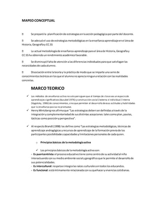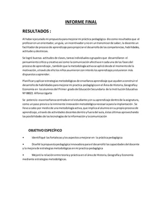 El informe final presenta los resultados de una propuesta para mejorar la práctica pedagógica del autor. Se lograron buenas actitudes de los estudiantes y el desarrollo del pensamiento crítico a través de una metodología activa. El autor identificó fortalezas y áreas de mejora, diseñó una propuesta innovadora y mejoró las estrategias metodológicas en las áreas de Historia, Geografía y Economía.