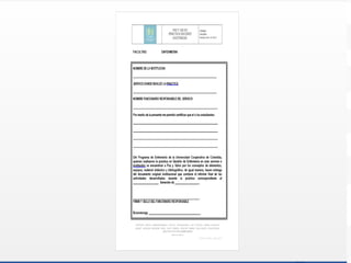 Este documento presenta los informes finales del proyecto docente asistencial y de productividad realizado por un grupo de estudiantes. Incluye la portada, contenido, introducción, objetivos, estrategias, resultados representados en tablas y gráficos, recomendaciones y referencias. Asimismo, contiene guías para la elaboración de los informes ejecutivo y de productividad, así como anexos con formatos para presentar la información requerida. El documento establece las fechas límite para la entrega de los informes