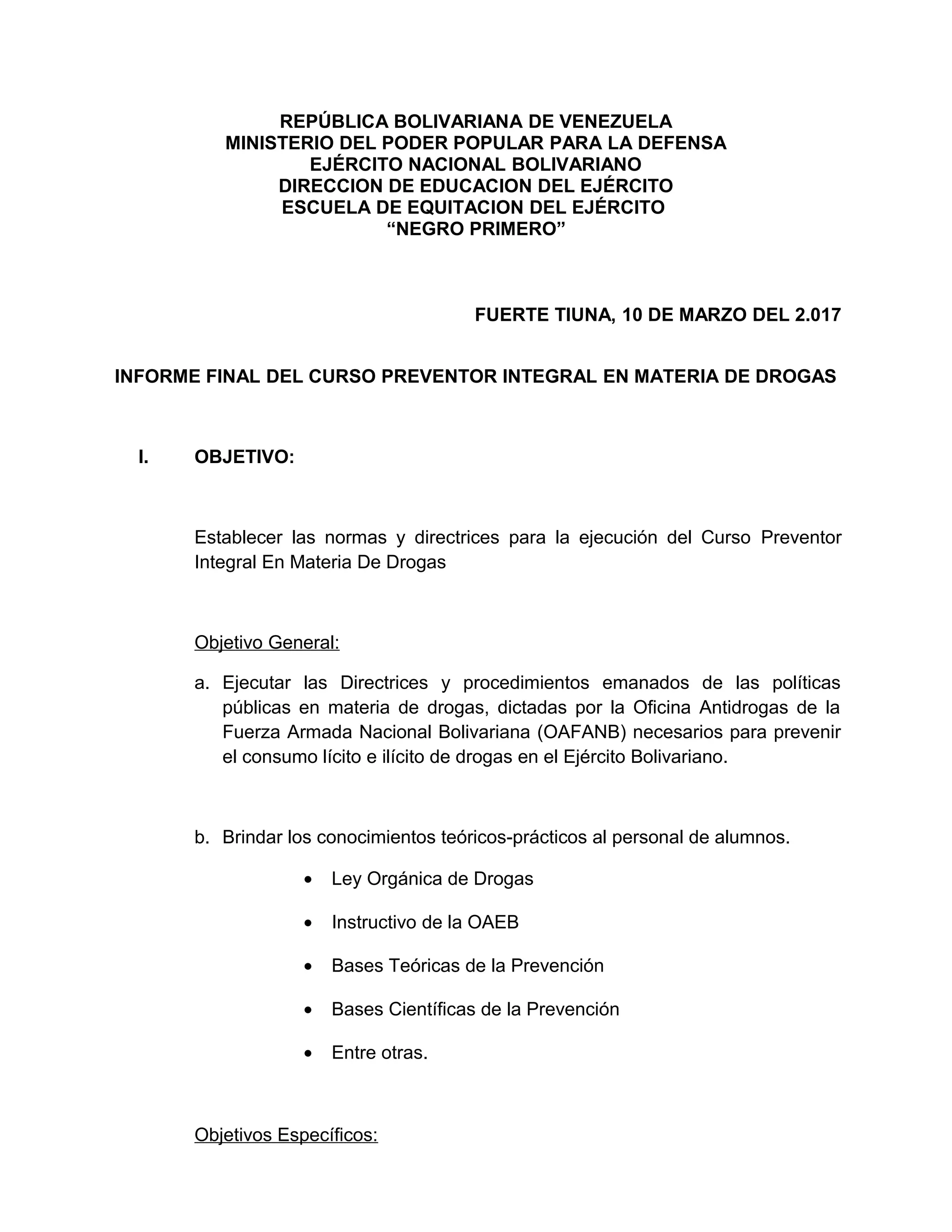 Este documento presenta el informe final de un curso preventivo sobre drogas impartido a personal militar en Venezuela. El curso tuvo como objetivo principal prevenir el consumo de drogas lícitas e ilícitas y brindar conocimientos sobre la legislación y efectos de las drogas. El curso se desarrolló en cuatro módulos que cubrieron temas como las bases legales de la prevención, factores de riesgo, efectos de las drogas y diseño de programas de prevención. Al finalizar, se concluyó que los alumnos adquirier