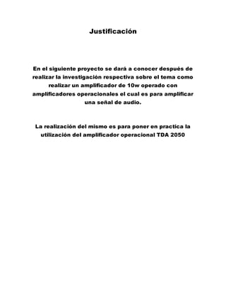 Este documento describe un proyecto para construir un amplificador de 10W utilizando amplificadores operacionales TDA2050. Explica la justificación del proyecto, los materiales necesarios como integrados, resistencias y condensadores, y los datos experimentales obtenidos al probar el amplificador con un osciloscopio. Concluye que se entendió el funcionamiento del amplificador operacional TDA2050 y cómo conectar los componentes para amplificar señales de audio y reproducirlas en un parlante de 10W.