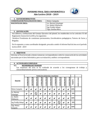El resumen describe las actividades realizadas por el área de informática durante el año lectivo 2018-2019. La mayoría de las reuniones del área se llevaron a cabo según lo programado. La elaboración del plan operativo anual y las planificaciones se completaron, aunque algunos maestros presentaron las planificaciones de manera tardía. Cerca del 24% de los estudiantes no alcanzaron los objetivos de aprendizaje y tuvieron que someterse a exámenes de recuperación. El área participó en eventos públicos para promover la
