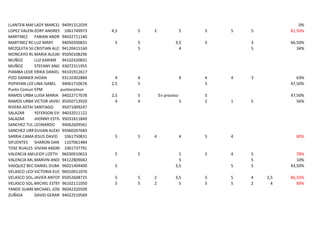 Este documento presenta un listado de alumnos con sus calificaciones en diferentes actividades de enseñanza-aprendizaje y evaluaciones de unidades académicas. Se incluyen el nombre, identificación y calificaciones de cada alumno, así como un porcentaje ponderado final. La mayoría de los alumnos obtuvieron calificaciones aprobatorias superiores al 70% que les permite aprobar las unidades.