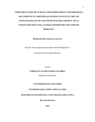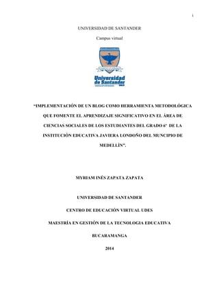 Este proyecto busca implementar un blog como herramienta metodológica para fomentar el aprendizaje significativo en ciencias sociales en estudiantes de grado 6o en la Institución Educativa Javiera Londoño en Medellín. El documento describe la situación problémica identificada, el marco de referencia y el diseño metodológico cualitativo utilizando encuestas, entrevistas y observación. Los resultados muestran que el blog puede mejorar las técnicas de estudio de los estudiantes y su rendimiento ac