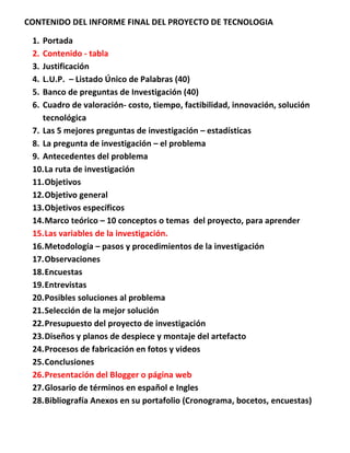 El documento presenta un resumen del informe final de un proyecto de tecnología. Incluye secciones como la justificación, un listado de palabras clave, preguntas de investigación, cuadros de valoración de costos y factibilidad de posibles soluciones, objetivos, marco teórico, metodología y conclusiones. El resumen también presenta una tabla con 36 posibles preguntas de investigación relacionadas con temas tecnológicos y de servicios públicos, evaluadas según factores como costo, tiempo, factibilidad e innovación.