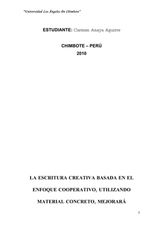 Este documento describe un proyecto de investigación que busca mejorar la producción de textos de los estudiantes del tercer grado de la Institución Educativa 88025 Ramón Castilla en Coishco, Perú en el año 2010. El proyecto propone utilizar la escritura creativa basada en un enfoque cooperativo y material concreto. El objetivo general es demostrar que este método mejorará significativamente la producción de textos de los estudiantes. El proyecto justifica la investigación debido a las dificultades comunes en la producción de textos