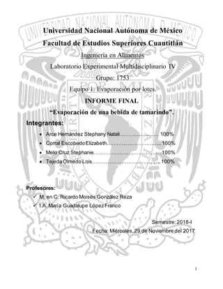 El informe final detalla el proceso de evaporación aplicado a la concentración de una bebida de tamarindo, incluyendo metodología, resultados y análisis de 15 corridas bajo diferentes condiciones de presión y vacío. Se discuten los conceptos básicos de evaporación, así como los factores que influyen en el proceso, como la temperatura, presión y características del producto. Finalmente, se presentan las conclusiones sobre la efectividad y eficiencia del método utilizado en el proyecto experimental.
