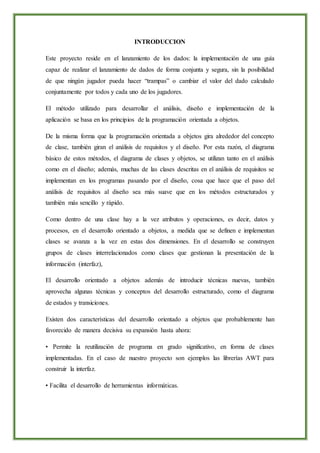 Este documento describe un proyecto de un juego de dados desarrollado por estudiantes de la Facultad de Ingeniería Ciencias Físicas y Matemática de la Universidad Central del Ecuador. El proyecto implementa un juego de dados que permite a los jugadores lanzar dados de forma conjunta y aleatoria para determinar un ganador. El documento explica el desarrollo del juego utilizando programación orientada a objetos en Java y NetBeans.