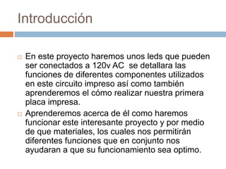 El documento detalla un proyecto sobre la creación de un circuito impreso para conectar LEDs a 120V AC, explicando el funcionamiento y cálculo de componentes como resistencias y diodos. Se describe el proceso de montaje y pruebas del circuito, así como las lecciones aprendidas a través de múltiples intentos de construcción. Finalmente, se concluye que se adquirieron conocimientos significativos sobre circuitos impresos y su correcto funcionamiento.
