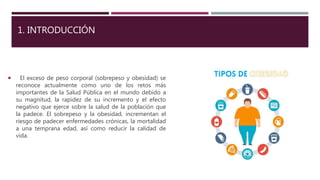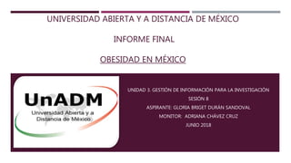 Este informe final presenta los resultados de una investigación sobre la obesidad en México realizada por Gloria Briget Durán Sandoval. México ocupa actualmente el segundo lugar mundial en obesidad, lo que es alarmante debido a los problemas de salud y la reducción de la calidad de vida que conlleva. La investigación incluyó una encuesta y entrevistas a personas con sobrepeso u obesidad para analizar sus hábitos alimenticios y de ejercicio. Los resultados mostraron niveles preocupantes de inactividad física y un estilo de vida